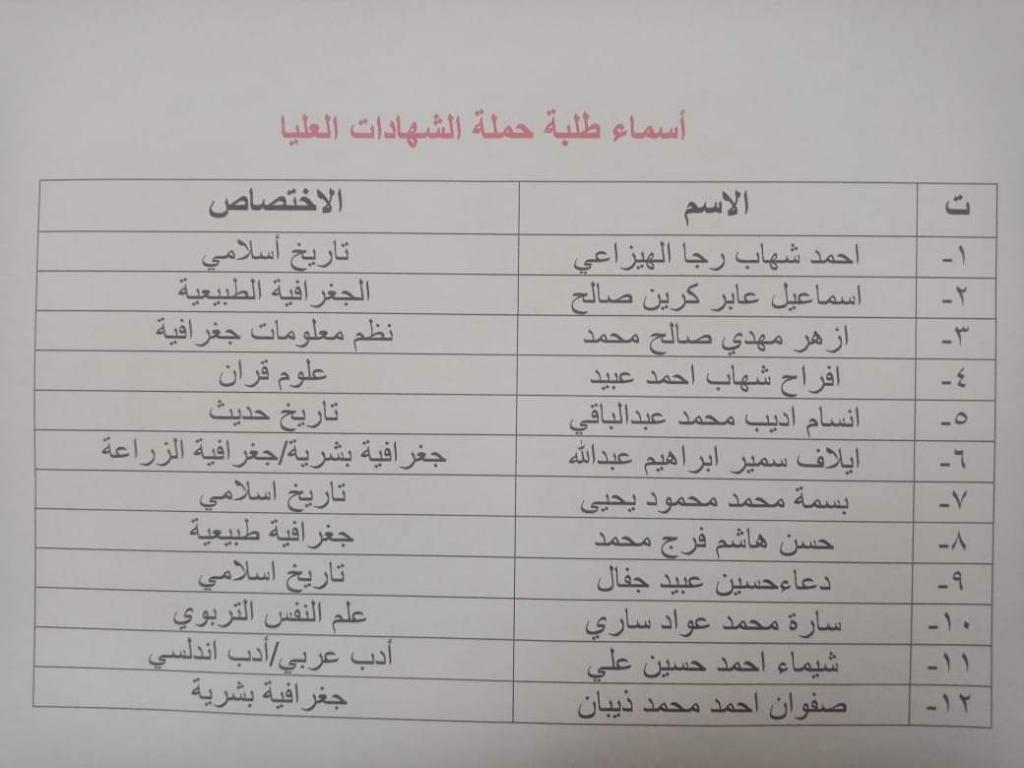 # اعلان هامالى طلبتنا الخريجين الثلاثة الأوائل وحملة الشهادات العليا في الاقسام العلمية المدرجة أسماؤهم في الصور ادناه يرجى الحضور الى الكلية يوم الثلاثاء المصادف ٣١ ايار ٢٠٢٢ لغرض استلام الكودات الخاصة بهم ممن لم يستلم كود فقط وتكون المراجعه و استلام الكود من شعبة الموارد البشرية.