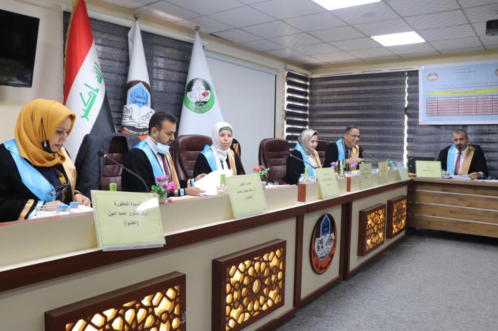 وترأس لجنة المناقشة أ.د. فضيلة عرفات محمد (رئيساً) وعضوية كل من أ.د. خالد جمال جاسم .أ.م.د. سمير يونس محمود .أ.م.د. سلوى احمد امين .أ.م.د. تنهيد عادل فاضل