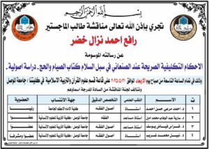 ناقشت كلية التربية للعلوم الإنسانية في جامعة الموصل رسالة ماجستير عن ( الأحكام التكليفية الصريحة عند الصنعاني في سبل السلام كتاب الصيام والحج- دراسة أصولية-)