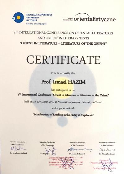 شارك الاستاذ الدكتور حازم ذنون اسماعيل التدريسي في قسم اللغة العربية / كلية التربية للعلوم الانسانية ممثلا عن جامعة الموصل في مؤتمر (ادب المشرق ) الذي اقامته جامعة نيوكولاس كوبرنيكوس تورون / بولندا مركز الثقافة العربية الذي شارك فيه (60) باحثا من 19 دولة معظمهم من اوربا وامريكا واليابان والدول العربية مثل الجزائر ومصر وكان ممثلا عن جامعة الموصل فضلا عن ترؤسه لاحدى الجلسات في اللغة الانكليزية للفترة من 26 31/3/2019