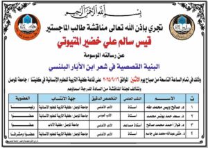 ناقشت كلية التربية للعلوم الإنسانية في جامعة الموصل رسالة ماجستير عن “البنية القصصية في شعر ابن الأبّار البلنسي” يوم الاثنين الموافق 16 / 6 / 2025 حضر جانبا منها الأستاذ الدكتور سعد رمضان الجبوري ورئيس القسم وعدد من تدريسيي الكلية.
