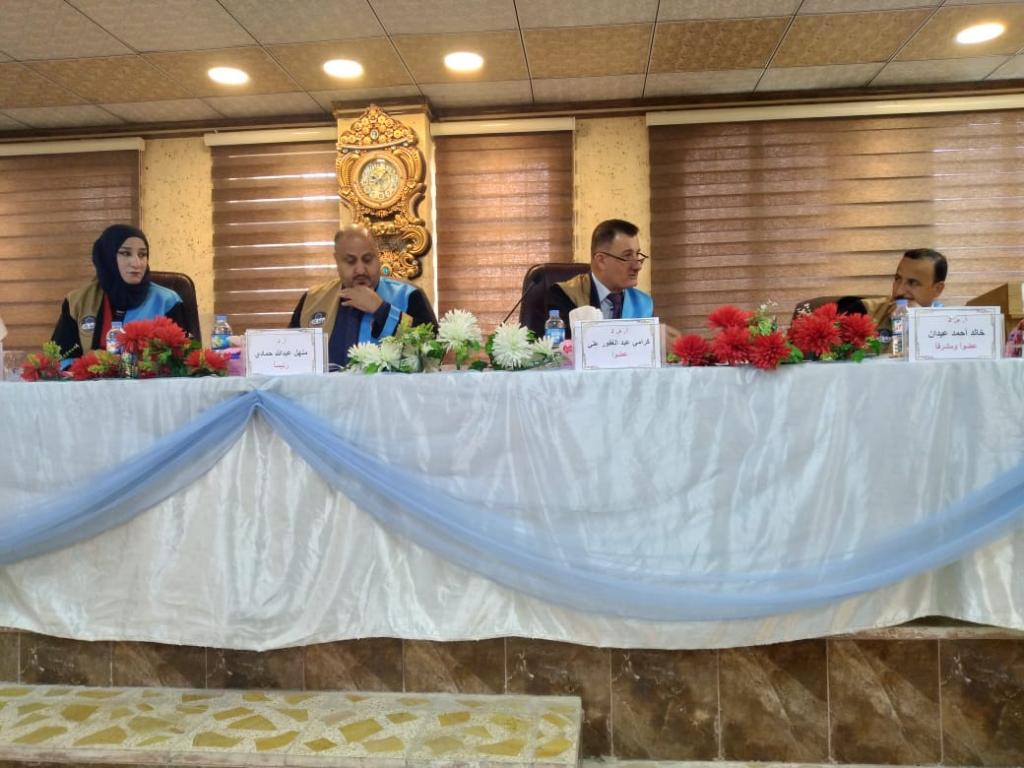 ترأس لجنة المناقشة الأستاذ الدكتور منهل عبدالله حمادي،وعضوية كل من الأستاذ المساعد الدكتور كرامي عبدالغفور علي، والمدرس الدكتورة غادة غانم مدين،وبأشراف وعضوية الأستاذ المساعد الدكتور خالد أحمد عيدان