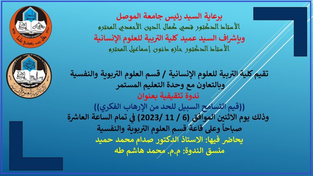 إشارة إلى كتاب وزارة التعليم العالي والبحث العلمي / دائرة البحث والتطوير / قسم تطوير وتحديث المناهج ذي العدد ب ت ٣ / ٧٠٧٣ بتاريخ ٢٨ / ٨ / ٢٠٢٣ المتضمن إقامة سلسلة من الورش والندوات واللقاءات الجماهيرية لمكافحة الإرهاب الفكري في شهر تشرين الثاني شرعت كليتنا بإقامة باكورة ندواتها بعنوان (التطرف الفكري آفة على مرّ العصور – الأسباب والمعالجات) ألقتها الاستاذ الدكتورة فضيلة عرفات محمد ، صبيحة يوم الاثنين الموافق ٥ / ١١ / ٢٠٢٣ على قاعة العلوم التربوية والنفسية