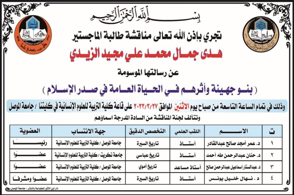 يوم الثلاثاء الموافق 28/3/2023الساعة العاشرة صباحا في رحاب قاعة كلية التربية للعلوم الانسانية/ كلية التربية للعلوم الانسانية