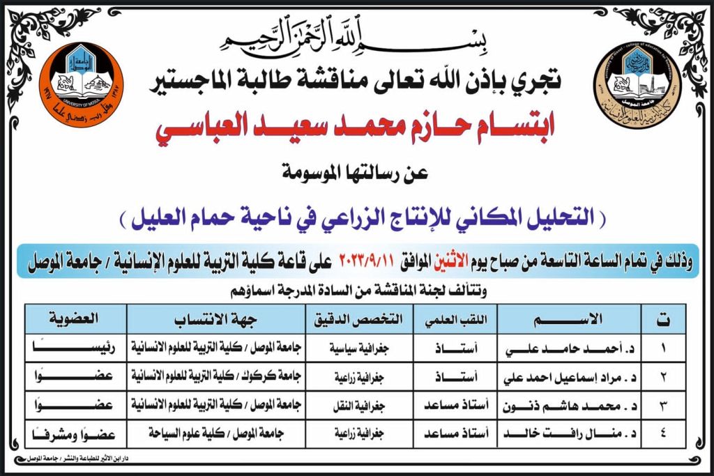 ناقشت كلية التربية للعلوم الإنسانية بجامعة الموصل رسالة ماجستير عن (القيادة بالتحفيز لدى مديري المدارس الإعدادية وعلاقتها بالتماثل التنظيمي من وجهة نظر المدرسين), يوم الأثنين 11 / 9 / 2023, حضر جانباً منها الأستاذ الدكتور حازم ذنون إسماعيل عميد الكلية ورئيس القسم الدكتور ياسر محفوظ حامد وعدد من تدريسيي الكلية.