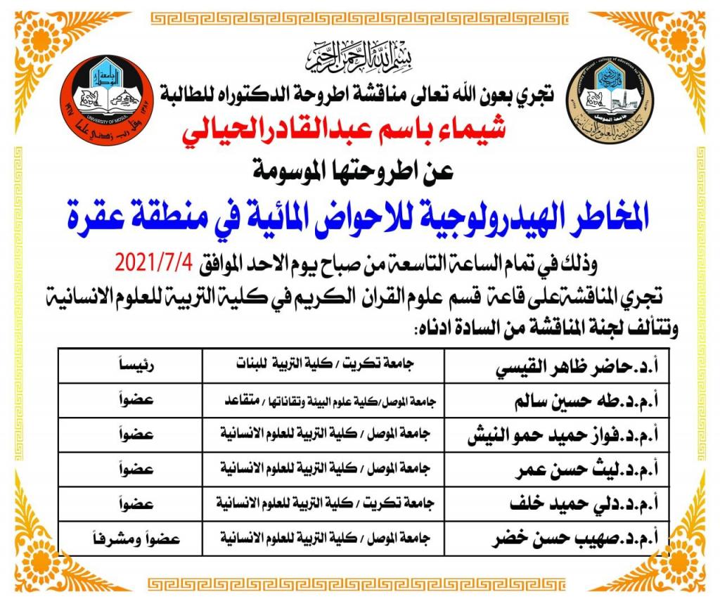 ناقش قسم الجغرافيا في كلية التربية للعلوم الإنسانية بجامعة الموصل أطروحة الدكتوراه عن:-(المخاطر الهيدرولوجية للأحواض المائية في منطقة عقرة)يوم 4/ 7/ 2021، حضر جانباً منها الأستاذ الدكتور حازم ذنون إسماعيل السبعاوي عميد الكلية وعدد من تدريسيي الكلية.تناولت الأطروحة التي تقدمت بها الطالبة (شيماء باسم عبدالقادر الحيالي) في قسم الجغرافيا، بالبحث والتحليل موضوع المخاطر الهيدرولوجية للأحواض المائية في منطقة عقرةتطرقت الدراسة إلى صياغة (4) من النماذج الهيدرولوجية للمخاطر باعتماد طريقة تحليل متعدد المتغيرات (Gis – MEC)،تهدف الدراسة إلى تقدير أحجام السيول وتدفق الذروة عن طريق تطبيق أنموذج ” Snyder’s Model ” وتصنف الأحواض حسب درجات خطورتها وتقييم انعكاساتها من منظور هيدرولوجي.ترأس لجنة المناقشة :-الأستاذ الدكتور حاضر ظاهر القيسيالأستاذ المساعد الدكتور طه حسين سالم الأستاذ المساعد الدكتور فواز حميد حمو النيشالأستاذ المساعد الدكتور ليث حسن خضر الأستاذ المساعد الدكتور دلي حميد خلفوبإشراف وعضويةالأستاذ المساعد الدكتور صهيب حسن خضر