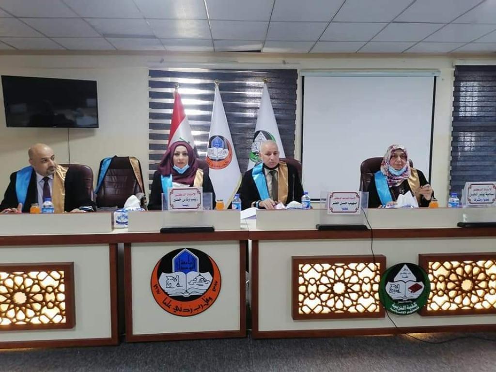 حيث ترأس لجنة المناقشة الأستاذ الدكتور زينب وناس خضير وعضوية كل من الأستاذ المساعد الدكتور صهيب حسن خضر والمدرس الدكتور محمد ابراهيم غثوان الاستاذ الدكتور اسباهية يونس عضوا ومشرفا .