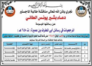 ناقش قسم اللغة العربية بكلية التربية للعلوم الإنسانية في جامعة الموصل يوم الأحد الموافق ٢٤ آب ٢٠٢٥ رسالة ماجستير عن: (المرجعيات في رسائل أبي المطرف بن عميرة ت ٦٥٨هـ)، حضرها عدد من التدريسيين وطلبة الدراسات العليا.