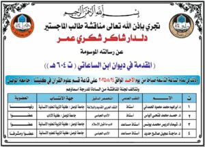 ناقش قسم اللغة العربية بكلية التربية للعلوم الإنسانية في جامعة الموصل يوم الاحد ٢٤ آب ٢٠٢٥ رسالة ماجستير عن : ( المقدمة في ديوان ابن الساعاتي ” ت ٦٠٤ ” هجرية ) ، حضرها عدد من التدريسيين وطلبة الدراسات العليا في الكلية
