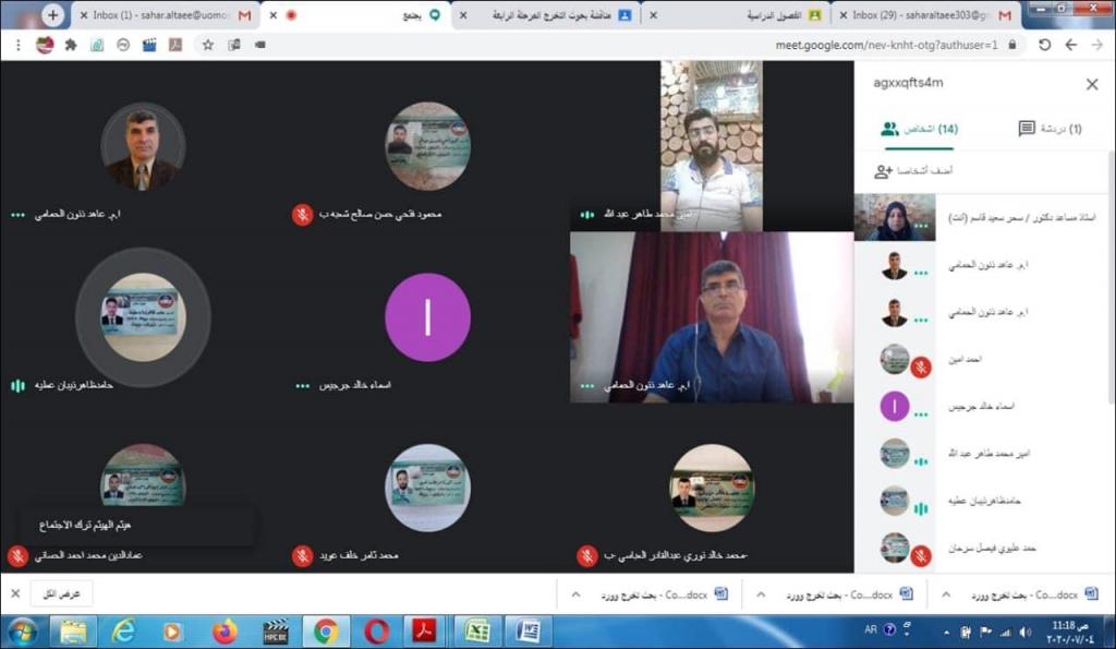 باشر قسم الجغرافيا بعقد جلسات مناقشة مشاريع التخرج لطلبة المرحلة الرابعة طبقا للجان المشكلة لذات الغرض وفي التخصصات الدقيقة في علم الجغرافية عبر المنصة الإلكترونية Google meet ابتداء من يوم السبت المصادف ٤ تموز ٢٠٢٠ واستمرار اللجان بالمناقشة لغاية يوم الاثنين ٦ تموز ٢٠٢٠