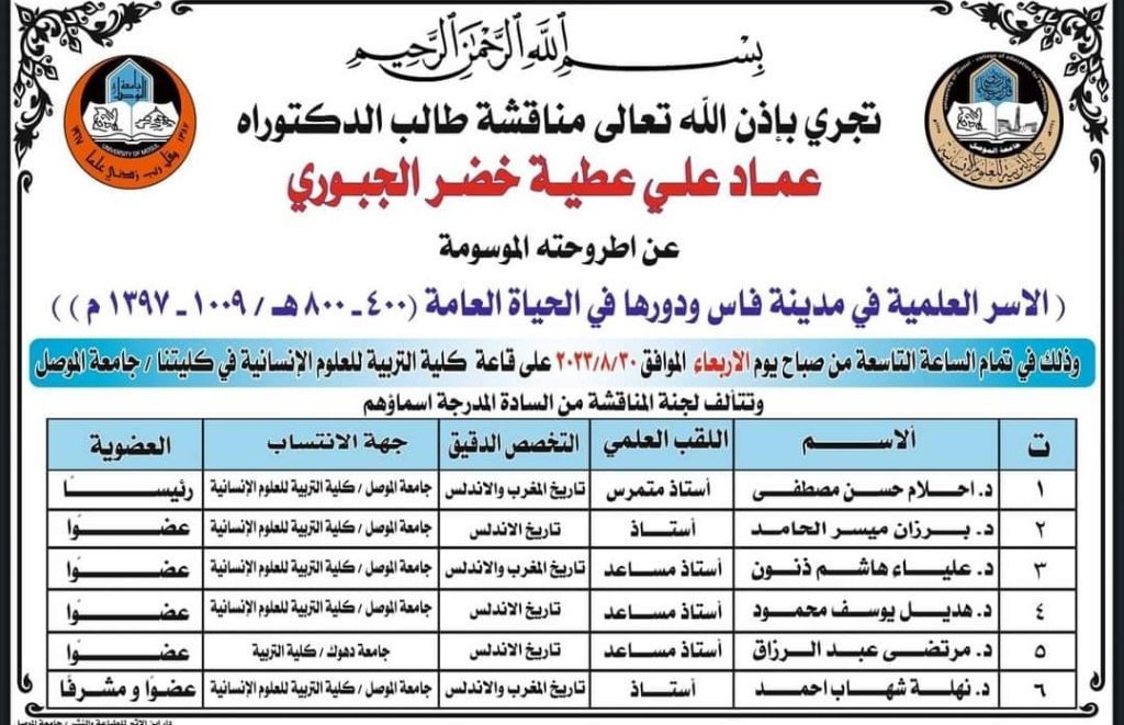 ناقشت كلية التربية للعلوم الانسانية بجامعة الموصل رسالة ماجستير (تربية المرأة في الفلسفة التربوية العربية الاسلامية والفلسفات الاوربية _دراسة مقارنة_).