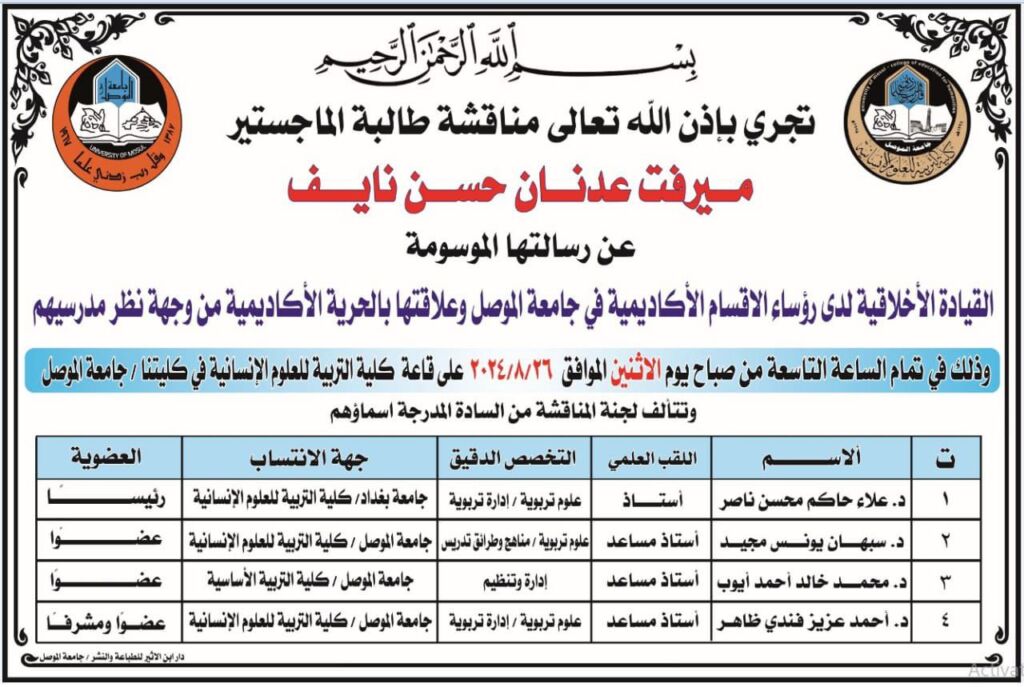 ناقشت كلية التربية للعلوم الإنسانية في جامعة الموصل رسالة الماجستير عن (تفسير الحنفي للعلامة الشيخ الحنفي (ت927) ه من سورة الكوثر الى آخر النظم الكريم – دراسة وتحقيق-)