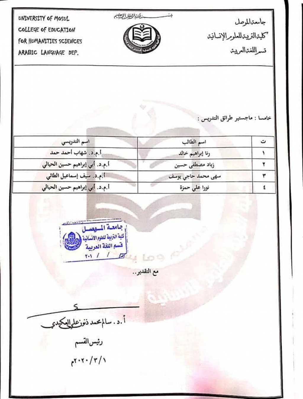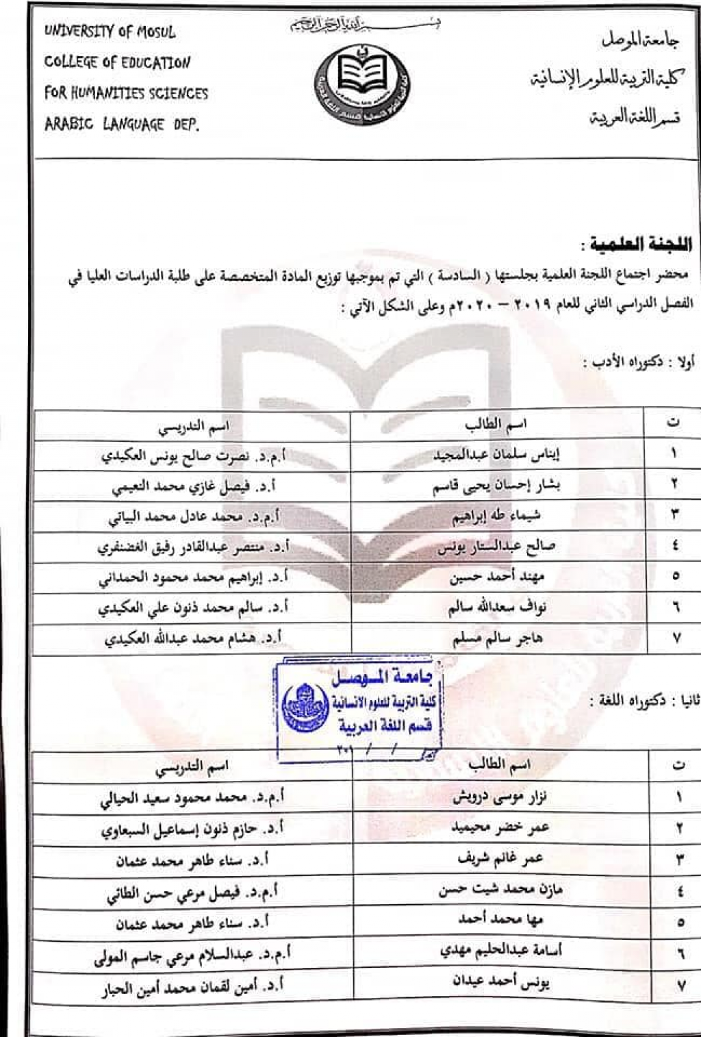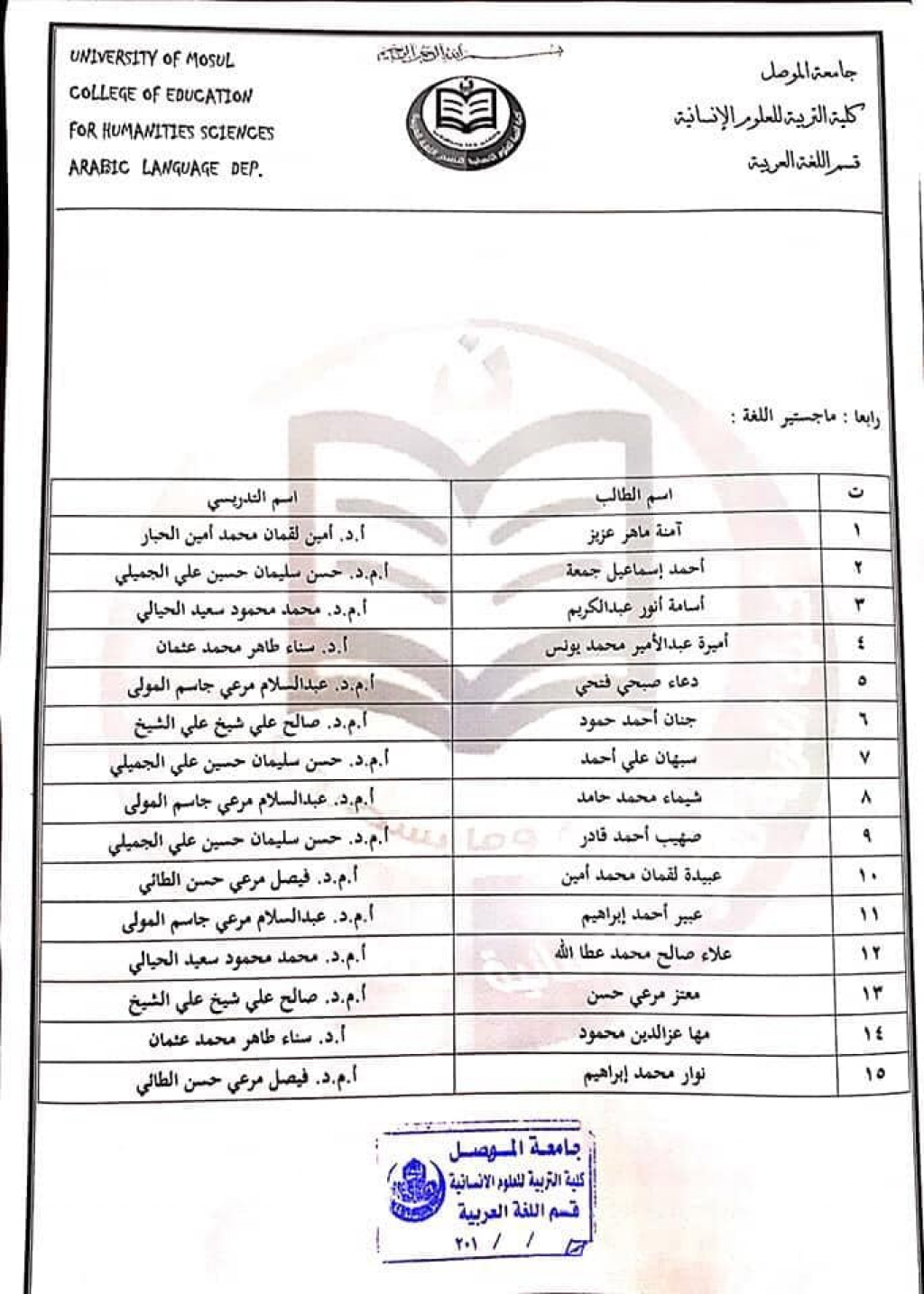 توزيع طلبة الدراسات العليا في قسم اللغة العربية بكلية التربية للعلوم الإنسانية جامعة الموصل…