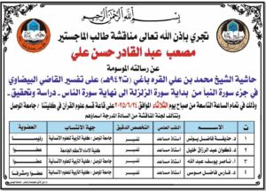 ناقشت كلية التربية للعلوم الانسانية في جامعة الموصل رسالة ماجستير عن حاشية الشيخ محمد بن علي القره باغي (ت 942ه) على تفسير القاضي البيضاوي في جزء سورة النبأ من بداية سورة الزلزلة إلى نهاية سورة الناس.