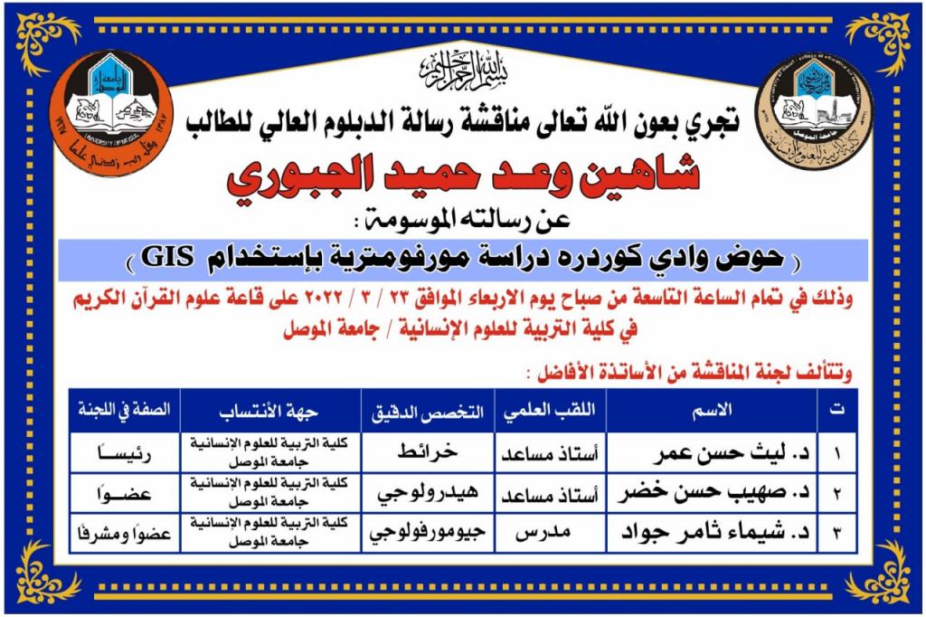 ناقش قسم الجغرافية في كلية التربية للعلوم الإنسانية بجامعة الموصل رسالة الدبلوم العالي عن :-