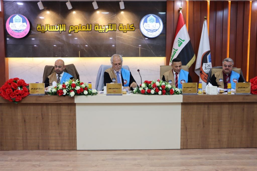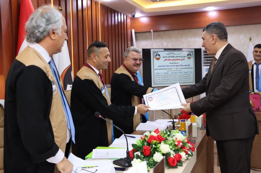 ناقش قسم العلوم التربوية والنفسية في كلية التربية للعلوم الانسانية بجامعة الموصل رسالة ماجستير عن (خُلق المتعلم وعلاقته بتطور الذات لدى طلبة جامعة الموصل )يوم الأربعاء (2/11/2022) حضر جانبا منها الاستاذ الدكتور حازم ذنون اسماعيل السبعاوي عميد الكلية وعدد من تدريسي الكلية .تناولت الرسالة التي تقدم بها الطالب (نشوان عبدالكريم يحيى شكر الطائي )في قسم العلوم التربوية والنفسية / خُلق المتعلم وعلاقته بتطور الذات لدى طلبة جامعة الموصل تطرقت الدراسة الى تعريف الطلبة على مفهوم خُلق المتعلم وفق المجالات الاربعة التي حددها (جيمس ريست)وعلاقتها بتطور الذات في الجوانب المعرفية والانفعالية والاجتماعية وأن أثرها الكبير في تنمية وتطوير شخصياتهم أذ يجب توعية المتعلمين أن الاخلاق بصفة عامة تعد من عوامل نجاح الانسان بصورة عامة والمتعلم بصورة خاصة في اي ميدان وسوء الاخلاق من اسباب فشلة في اي ميدان كما ان الاخلاق زينة للمتعلم كلما تحلى بها زينَ بها نفسه أكثر وأضفى على نفسه قيمة واحترام اكثر وأن معتقدات الفرد عن فاعليته الذاتية وتطورها تظهر من خلال الادراك المعرفي للقدرات الشخصية والخبرات المتعددة سواء بطريقة مباشرة او غير مباشرة لذا فأن فاعلية الذات وتطورها تحدد المسار الذي يتبعه كإجراءات سلوكية .تهدف الدراسة الى التعرف على خُلق المتعلم وعلاقته بتطور لدى طلبة الجامعة، وتحقيقاً لأهداف البحث تمت الإجابة على الأسئلة الآتية :-1- ما مستوى خُلق المتعلم لدى طلبة جامعة الموصل ؟2- هل هناك فرق ذو دلالة احصائية عند مستوى دلالة (0,05) لخُلق المتعلم لدى طلبة الجامعة الموصل في ضوء بعض المتغيرات :أ. النوع الاجتماعي (ذكور / إناث ) ب. التخصص الدراسي (علمي / انساني ) ج- المستوى الدراسي ( الثاني / الرابع )3- ما مستوى تطور الذات لدى طلبة جامعة الموصل ؟4- هل هناك فرق ذو دلالة احصائية عند مستوى دلالة (0,05) لتطور الذات لدى طلبة الجامعة الموصل في ضوء بعض المتغيرات :أ. النوع الاجتماعي (ذكور / إناث ) ب. التخصص الدراسي (علمي / انساني ) ج- المستوى الدراسي ( الثاني / الرابع ) 5- العلاقة بين خُلق المتعلم وتطور الذات لدى طلبة الجامعة الموصل .تراس لجنة المناقشة :-الاستاذ الدكتور: أسامة حامد محمدوعضوية كل من الاستاذ المساعد الدكتور: قاسم محمد نده ، والاستاذ المساعد الدكتور: علاء الدين علي حسين وبأشراف وعضوية :-الاستاذ المساعد الدكتور: سعد غانم علي