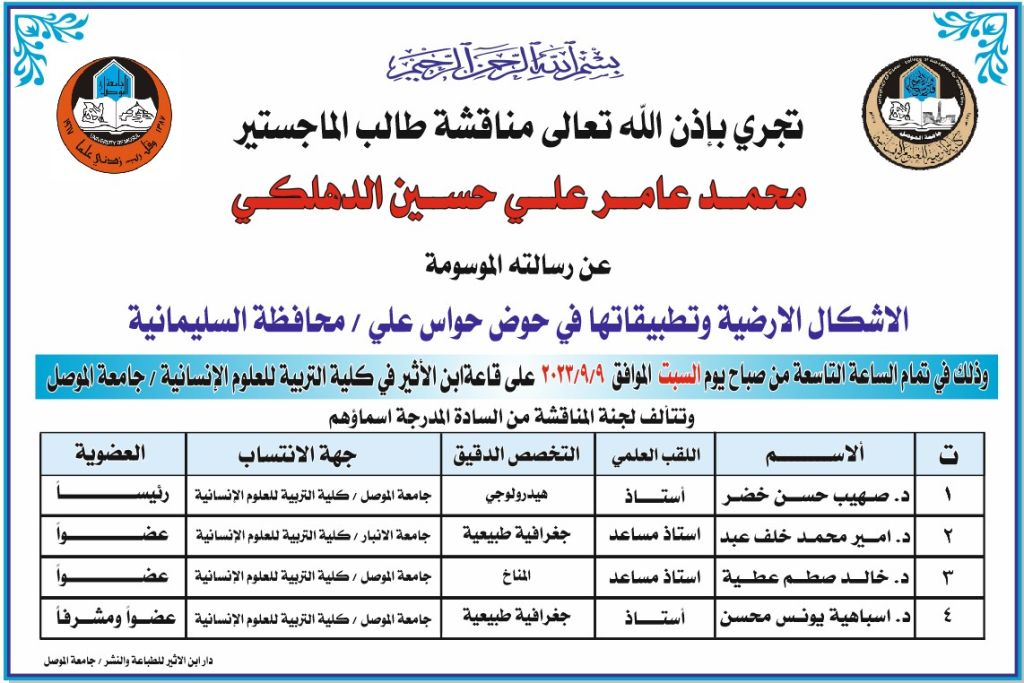ناقشت كلية التربية للعلوم الانسانية بجامعة الموصل رسالة ماجستير عن دور الانصار العسكري في كتاب المغازي للواقدي (ت: 207هـ/822م) (دراسة تاريخية كمية)