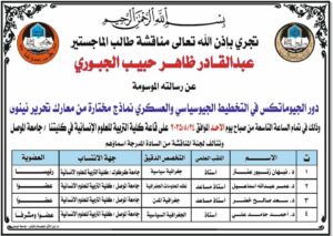 ناقش قسم الجغرافية بكلية التربية للعلوم الإنسانية في جامعة الموصل اليوم الأحد ٢٤ آب ٢٠٢٥ ، رسالة ماجستير عن : ( دور الجيوماتكس في التخطيط الجيوسياسي والعسكري نماذج مختارة من معارك تحرير نينوى ) ، حضر جانباً منها السيد عميد الكلية الأستاذ الدكتور سعد رمضان محمد الجبوري وعدد من التدريسيين وطلبة الدراسات العليا في الكلية .
