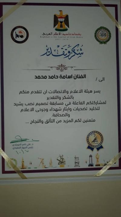شارك الاستاذ الدكتور اسامة حامد محمد التدريسي في قسم العلوم التربوية والنفسية في كلية التربية للعلوم الانسامية جامعة الموصل في مسابقة تصميم نصب شهيد الصحافة الذي اقامته هيئة الاعلام والاتصالات وبرعاية الجامعة العربية في العاصمة بغداد يوم الاثنين الموافق 8/10/2018 وقد تم تكريمه لتقديمه نموذج لنصب شهيد الصحافة وتعد هذه المشاركة انجاز مهم وابداع الذي اخا فيه الاستاذ الدكتور اسامة حامد بين الفن والاكاديمة