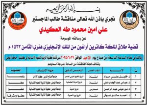 ناقشت كلية التربية للعلوم الإنسانية في جامعة الموصل رسالة ماجستير عن (قضية طلاق الملكة كاترين اراغون من الملك الإنجليزي هنري الثامن 1533م) يوم الأحد الموافق 29/6/2025 للطالب علي امين محمود طه العكيدي حضر جانبًا منها رئيس القسم الأستاذ وعدد من تدريسي الكلية.