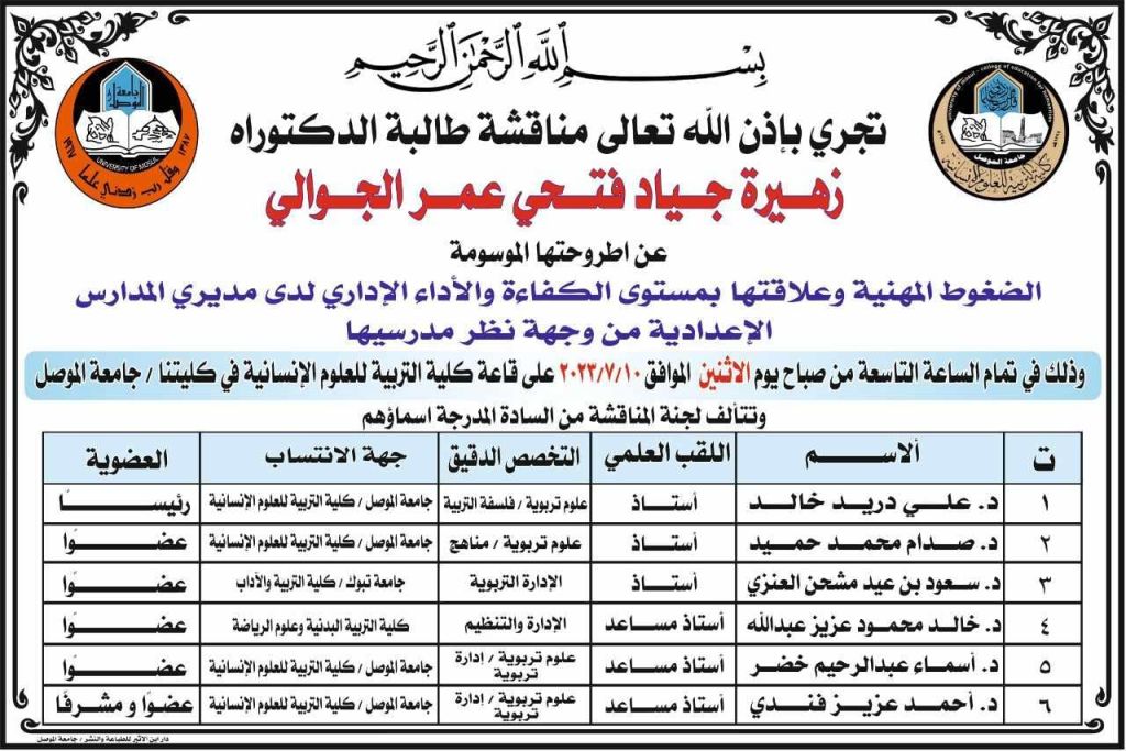 ناقش قسم التاريخ في كلية التربية للعلوم الإنسانية بجامعة الموصل رسالة ماجستير عن :- ( لبنان والمشاريع الغربية واحلافها في المنطقة العربية 1950-1958 ) ,يوم الاحد 2023/7/9