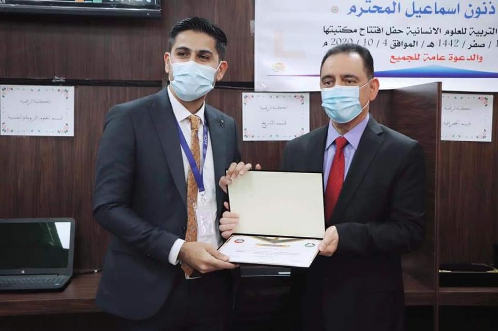 الطالب في كلية التربية للعلوم الانسانية للعلوم الانسانية/قسم اللغة الانكليزية وهو إعادة تأهيل مكتبة كليته .