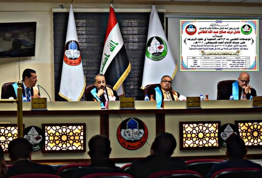 مناقشة رسالة الماجستير الموسومة (توجيهات الطيبي (ت 743 هـ ) النحوية في كتاب عقود الزبرجد على مسند الإمام أحمد للسيوطي( ت 911هـ) للطالب (عادل ترف صالح عبدالله)