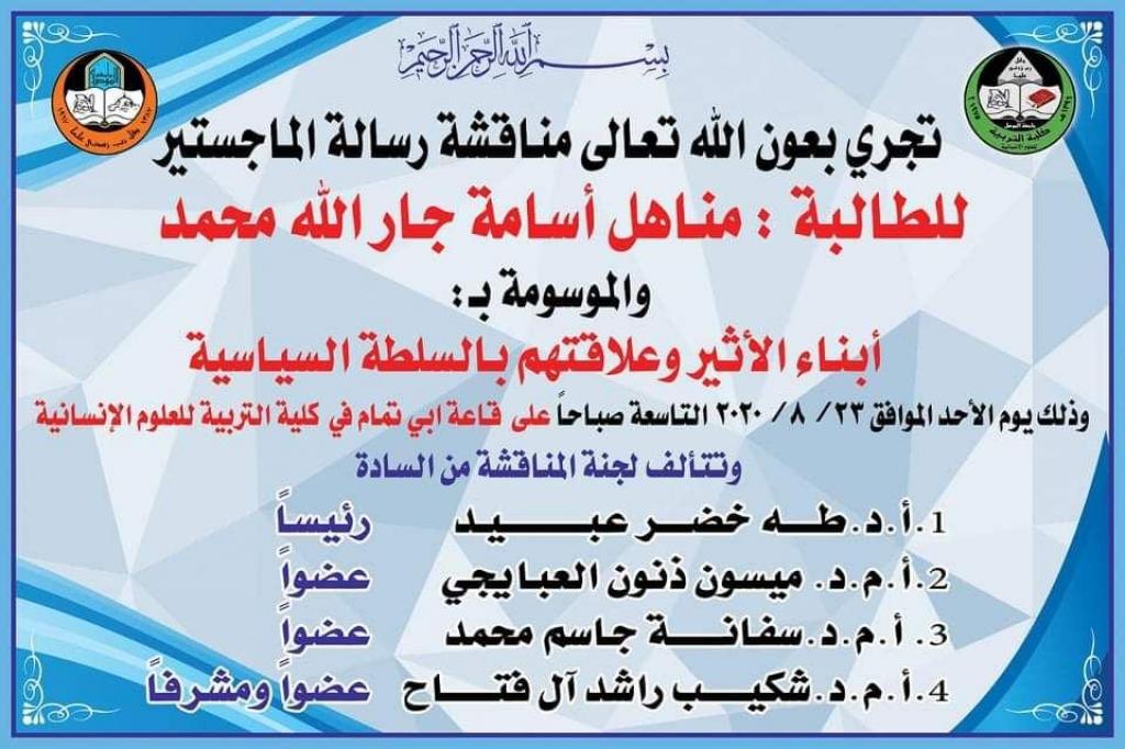 مناقشة رسالة الماجستير والموسومة ( أبناء الاثير وعلاقتهم بالسلطة السياسية )