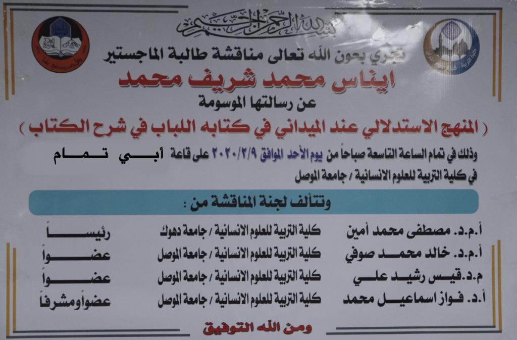 على بركة الله تعالى جرت مناقشة طالبة الماجستير ” ايناس محمد شريف محمد” وذلك يوم الاحد الموافق 9/2/2020 على قاعة أبي تمام في كلية التربية للعلوم الانسانية/ قسم علوم القرآن الكريم عن رسالتها الموسومة ب (المنهج الاستدلالي عند الميداني في كتابه اللباب في شرح الكتاب)