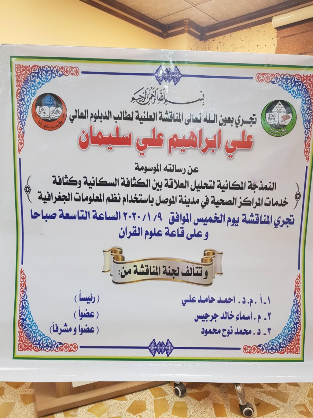 ‎جرت وبعون الله وفضله اليوم الخميس الموافق 9/1/2020 مناقشة طالب الدبلوم العالي / قسم الجغرافية للطالب(علي ابراهيم علي سليمان ) ،