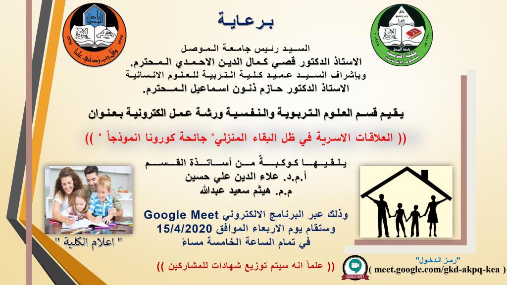 (( العلاقات الاسرية في ظل البقاء المنزلي” جائحة كورونا انموذجاً ” ))وذلك عبر البرنامج الالكتروني Google Meet
