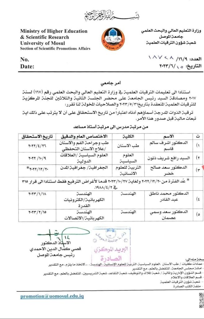 ﺍﻷﺳﺗﺎﺫ ﺍﻟﺩﻛﺗﻭﺭ ﺻﺩﺍﻡ ﺟﺎﺳﻡ ﷴ ،ﺍﻷﺳﺗﺎﺫ ﺍﻟﻣﺳﺎﻋﺩ ﺍﻟﺩﻛﺗﻭﺭ ﺳﺭﻯ ﻣﻣﺗﺎﺯ ﻋﺑﺩﷲ ،ﻭﺑﺈﺷﺭﺍﻑ ﻭﻋﺿﻭﻳﺔ ﺍﻷﺳﺗﺎﺫ ﺍﻟﺩﻛﺗﻭﺭ ﺷﻛﻳﺏ ﺭﺍﺷﺩ ﺑﺷﻳﺭ ﺁﻝ ﻓﺗﺎﺡ.