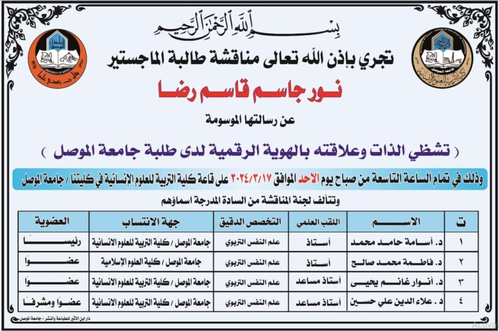 برعاية السيد عميد كلية التربية للعلوم الإنسانية الأستاذ الدكتور حازم ذنون إسماعيل السبعاوي المحترم أقامت كلية التربية للعلوم الانسانية (ندوة تثقيفية ) تحت عنوان (مفهوم اضطراب طيف التوحد وانواعه واعراضه) يوم الاحد الموافق 17 / 3 / 2024 حضر جانباً منها السيد العميد وبعضاً من تدريسي الكلية ومنتسبيها