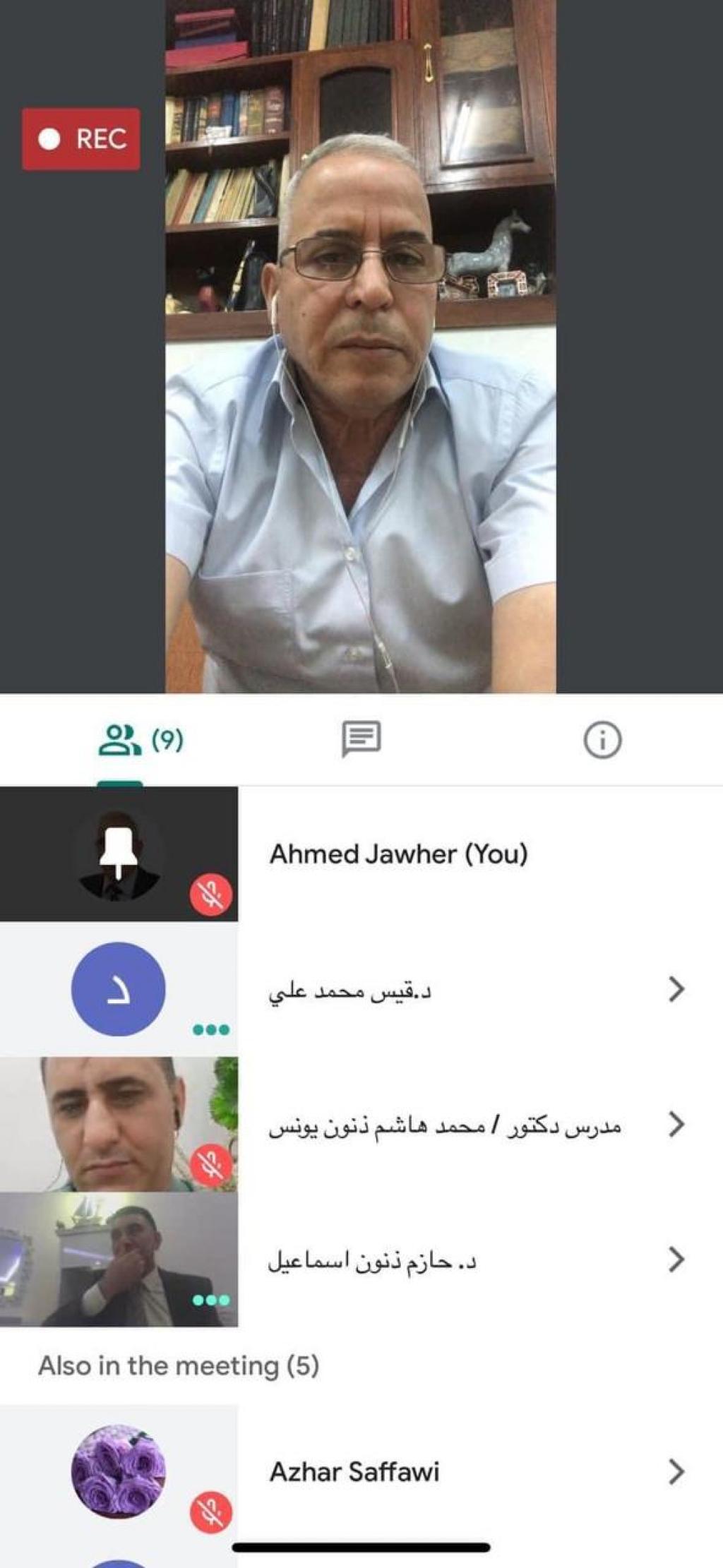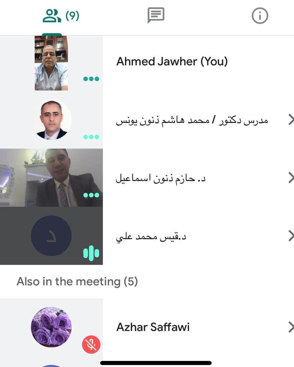 الاستمرار بتنفيذ مناقشات طلبة الدراسات العليا الكترونيا (كليا أو جزئيا) باستخدام منصات الاتصال الفيديوية، على أن تتم المناقشة بالإشراف المباشر من معاون العميد للشؤون العلمية..