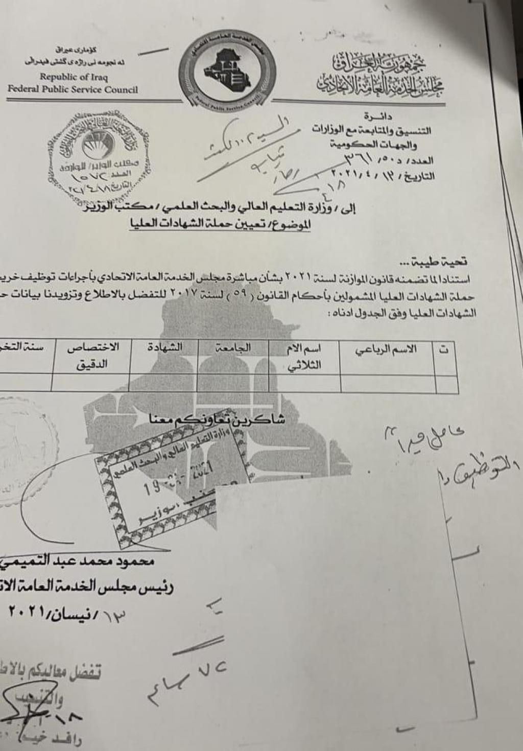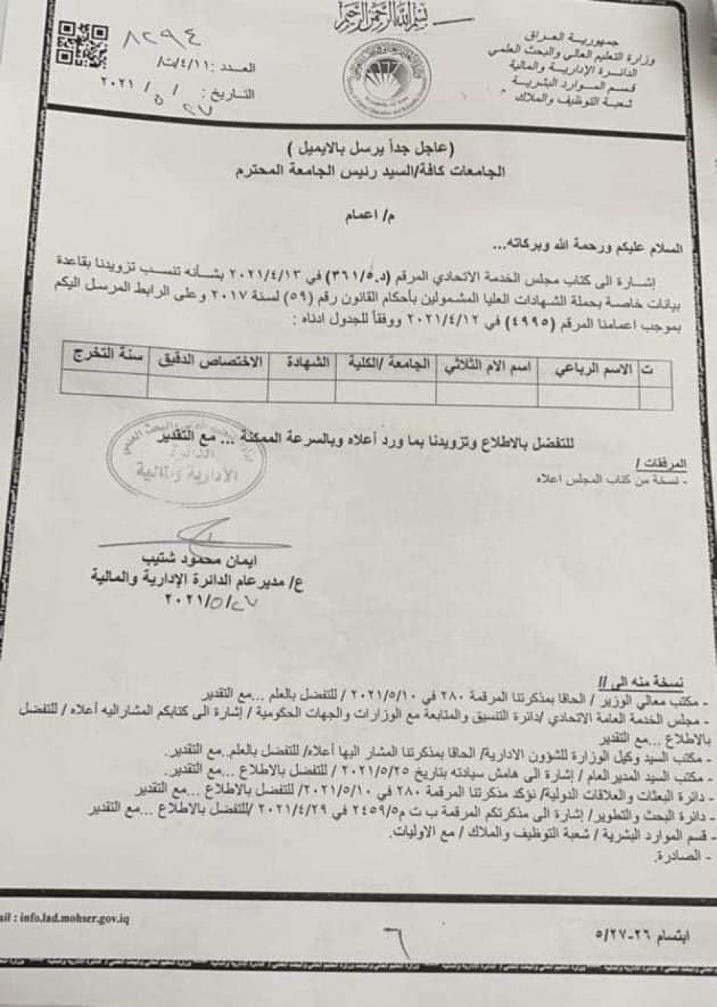 إعلان مهمنرفق لكم طيًّا نسخة من كتاب وزارة التعليم العالي والبحث العلمي / الدائرة الإدارية والمالية / قسم الموارد البشرية / شعبة التوظيف والملاك المرقم ١١ / ٤ / ت / ٨٢٩٤ في ٢٧ / ٥ / ٢٠٢١ المعطوف على كتاب مجلس الخدمة الاتحادي المرقم(د.٥/ ٣٦١ – بتاريخ ١٣ / ٤ / ٢٠٢١) بشأن تزويدهم بقاعدة بيانات خاصة بحملة الشهادات العليا المشمولين بأحكام قانون (٥٩) لسنة (٢٠١٧) ؛ لذا توجب حضوركم إلى الكلية مع جلب المستمسكات المطلوبة ، وإكمال استمارة التعيين.وفق الله الجميع