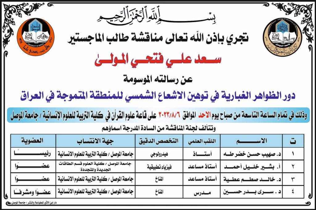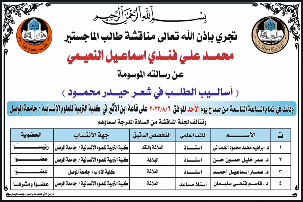 الأستاذ الدكتورة فضيلة عرفات محمد وعضوية كل الأستاذ المساعد الدكتور رائد ادريس يونس والاستاذ المساعد الدكتورة رقية رافد شاكر نصيف وبإشراف وعضوية الأستاذ الدكتورة ندى فتاح زيدان ذنون.