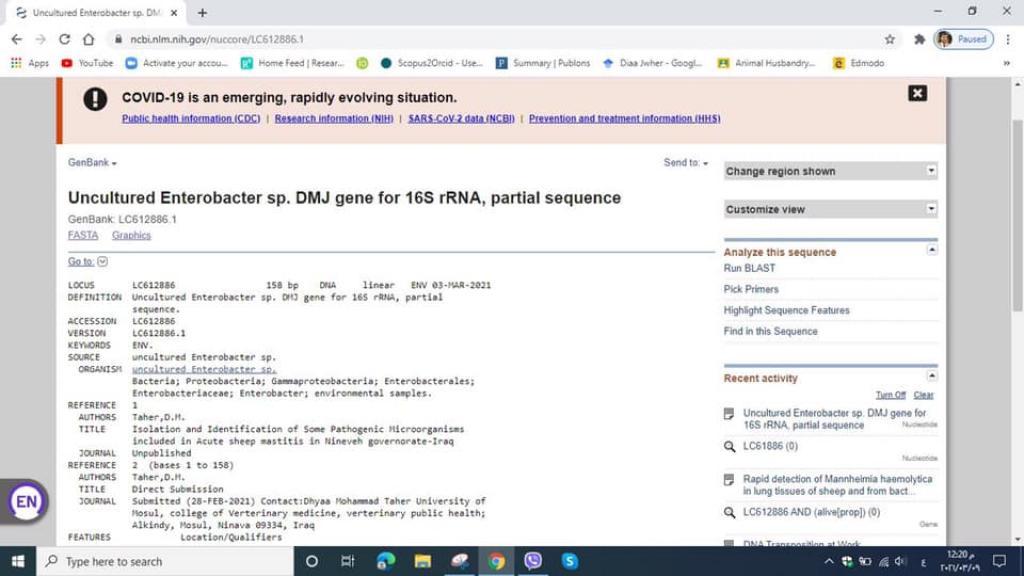 Assistant Professor, Dr. Dhiya Mohammed Taher Jawhar of College of Veterinary Medicine, achieved a scientific accomplishment by discovering a new bacterial strain in Iraq.The discovery came through a research by the scholar, in which he sought the causes of the inflammation that smites the udders of sheep usually caused by Enterobacter sp.Noteworthy is that the strain, which was registered for the scholar, was registered in the Iraqi Gene Bank, reference no. LC612886.1, and in the Iraqi NCBI, as well.For more info, please visit the following website:https://www.ncbi.nlm.nih.gov/nuccore/LC612886.1