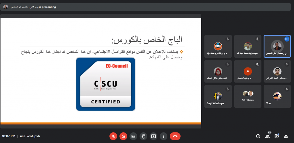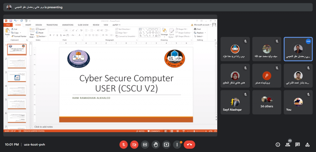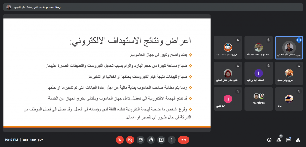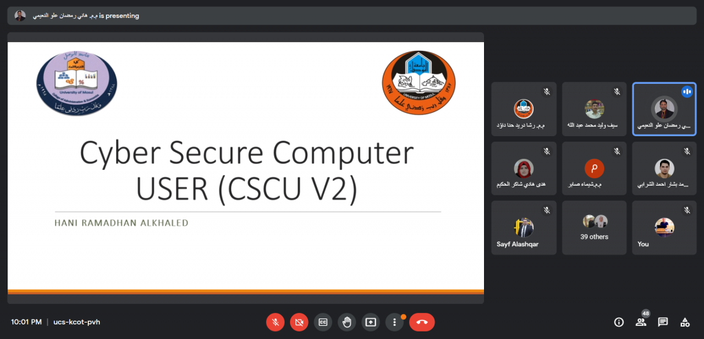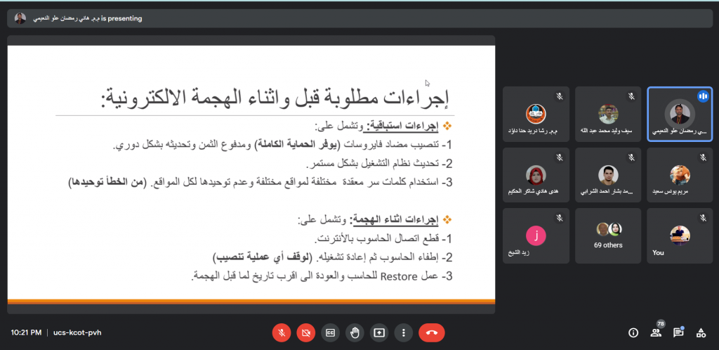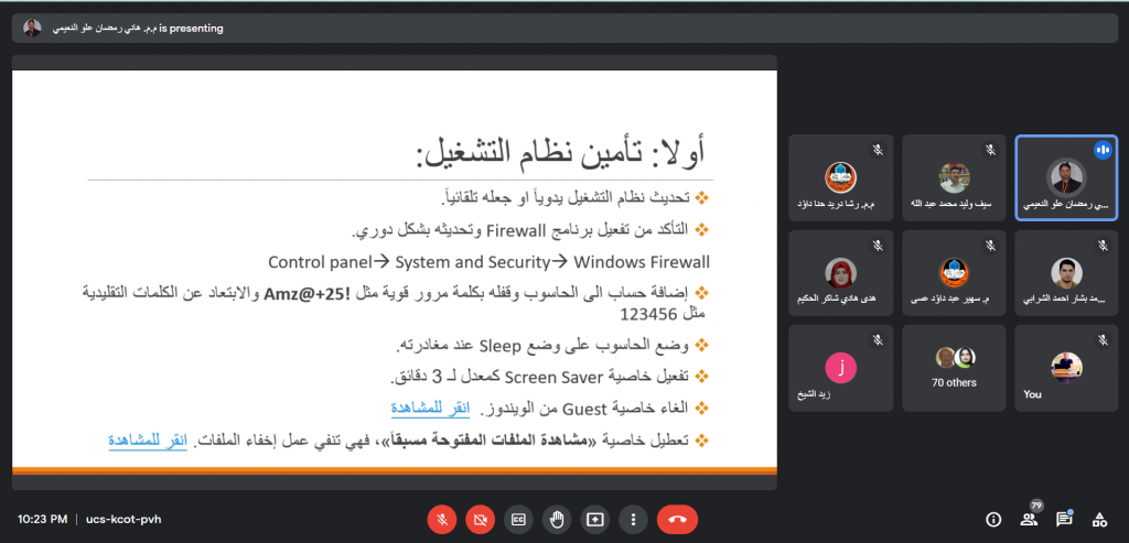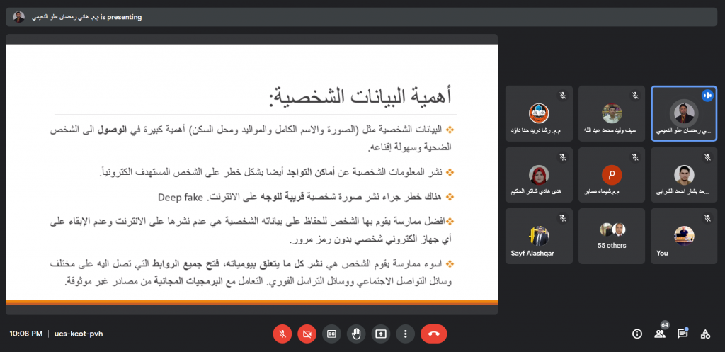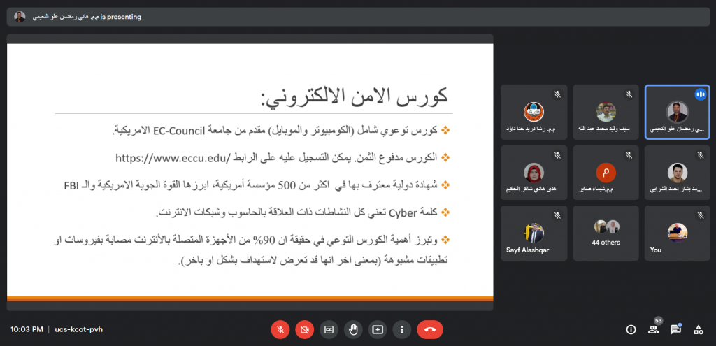Today’s lecture was entitled (“Cybersecurity” a comprehensive awareness course), which was presented by assistant teacher Hani Ramadan Allaw. The lecture shed light on the latest developments in the field of cybersecurity and ways to protect users’ personal information and immunization against intrusions and malicious software spread on the Internet.