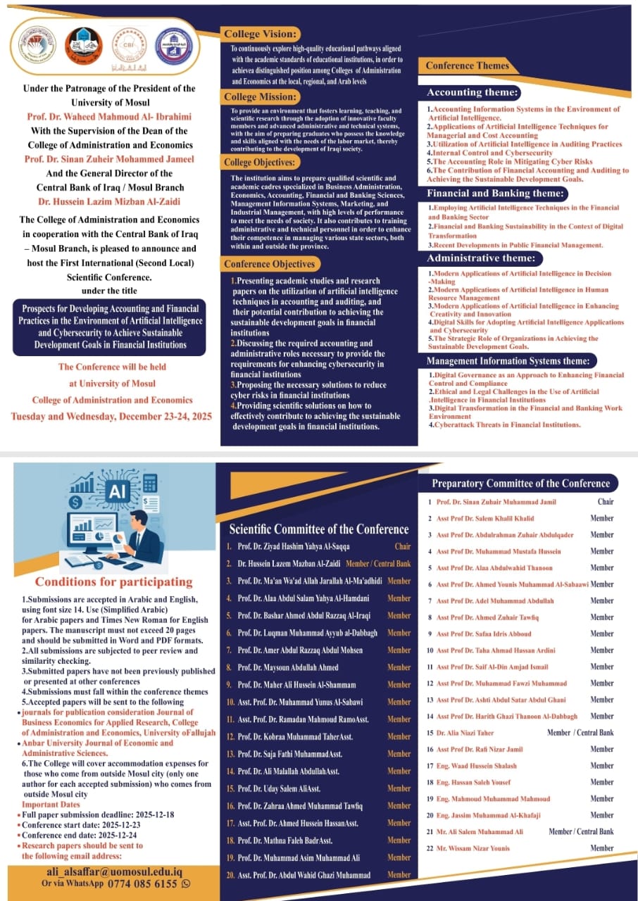 The College of Administration and Economics – University of Mosul Announces the Convening of the First International Scientific Conference on Developing Accounting and Financial Work in Light of Artificial Intelligence and Cybersecurity to Achieve Sustainable Development Goals