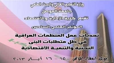 admin_omar2023-04-14T22:04:23+00:00Assess the College of Business and Economics Motmra scientifically titled "Challenges of the work of the Iraqi organizations in light of the requirements of infrastructure and economic development" for the period from 15-16 / May / 2013 and within the following themesAxis of the economy: the economics of infrastructure and economic developmentThe development of the infrastructure infrastructure towards sustainable developmentThe relationship between the infrastructure and the environmentChallenges facing the Iraqi organizations in the light of developments in the Iraqi economyThe development of the economic efficiency of Iraqi organizations in the light of sustainable developmentAxis of information and communication technologiesThe reality of [Read More]