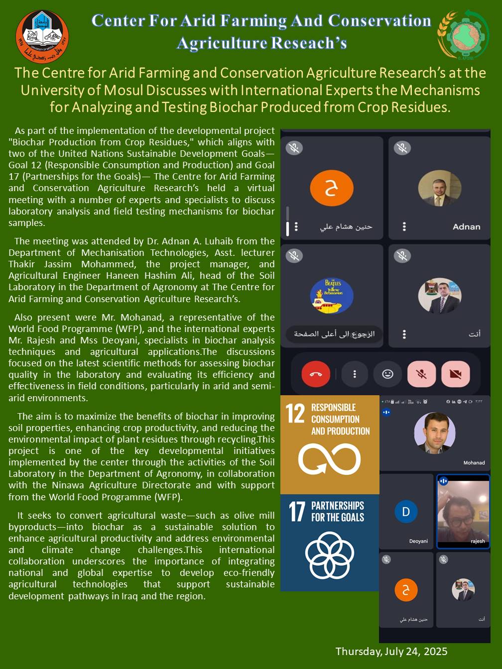 The Centre for Arid Farming and Conservation Agriculture Research’s at the University of Mosul Discusses with International Experts the Mechanisms for Analyzing and Testing Biochar Produced from Crop Residues.