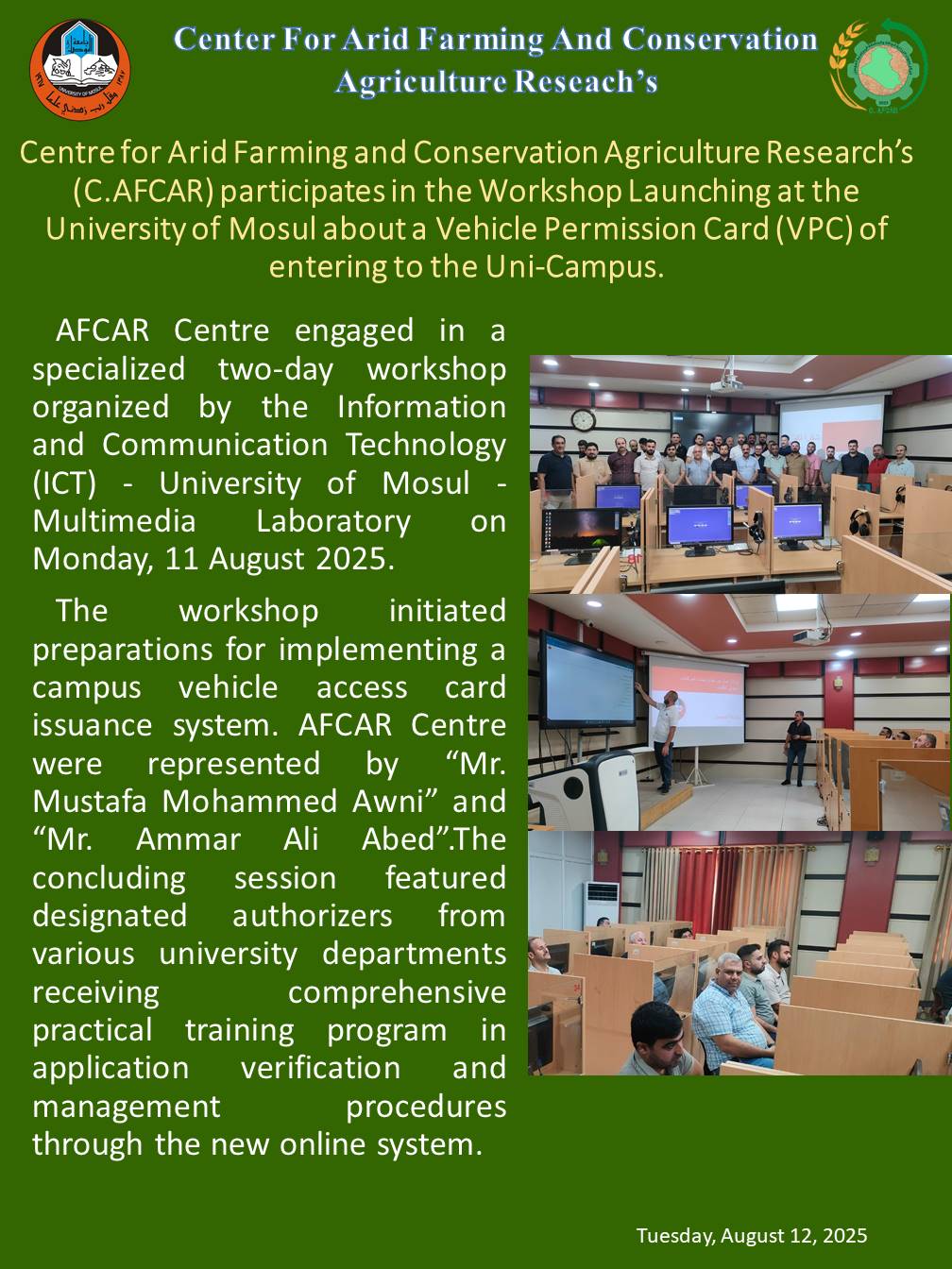 Centre for Arid Farming and Conservation Agriculture Research’s (C.AFCAR) participates in the Workshop Launching at the University of Mosul about a Vehicle Permission Card (VPC) of entering to the Uni-Campus.