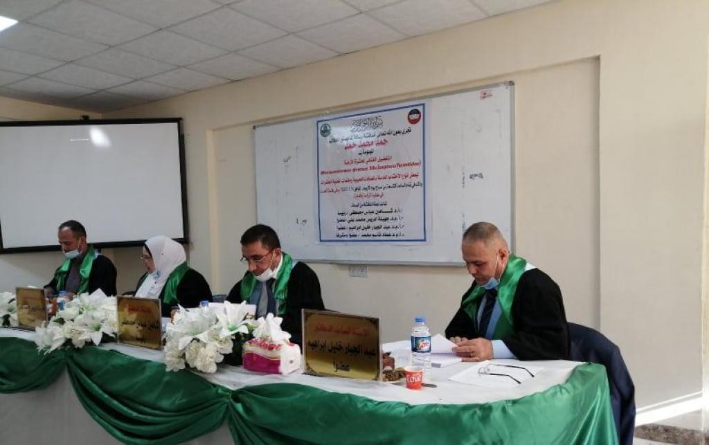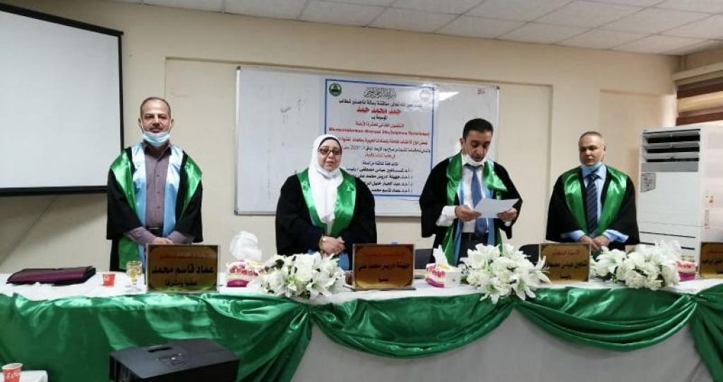 The Dean of the College, Assistant Prof. Dr. Mohammed Younis Al-Allaf has attended a master’s thesis discussion in the Department of Plant Protection, for the student (Mr. Hamad Muhammad Hamad) on Wednesday 4/11/2020 in the Al-Hadba’a hallThus, the discussion committee read the decision which included acceptance of the thesis and award the student an M.Sc. degree.
