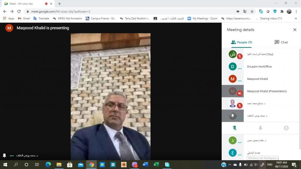 The Dean of the College, Assistant Prof. Dr. Mohammed Younis Al-Allaf has attended a master’s thesis discussion in the Department of Soil Sciences and Water Resources, for the student (Mr. Maqsood Khalid) entitled “Effects of some soil amendments on moisture content of calcareous soil and ZEA MAYS L. production under irrigation system ” by using the interactive program MEET on Sunday 8/11/2020.The discussion committee consisted of: