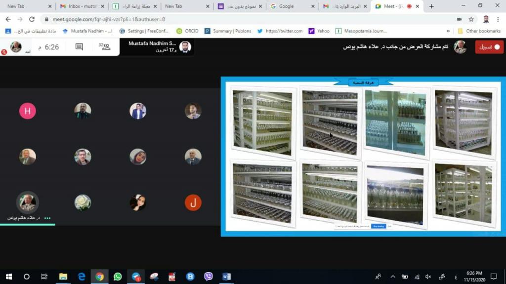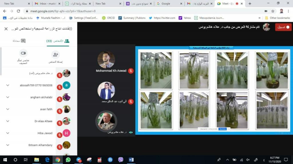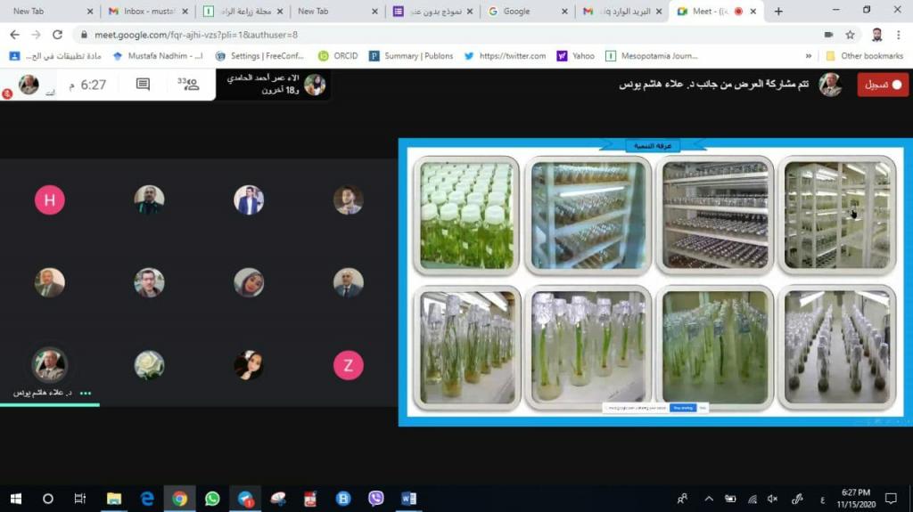 Under the Patronage of the Dean of the College, Assistant Prof. Dr. Mohammed Younis Al-Allaf and with the supervision of Dr. Alaa Hashim, the Department of Horticulture and Landscape Architecture held an electronic training course entitled ” Production technologies for tissue culture and natural products extraction ” by using the interactive program MEET on Sunday, 15-11- 2020 at 6 pm Iraq time.