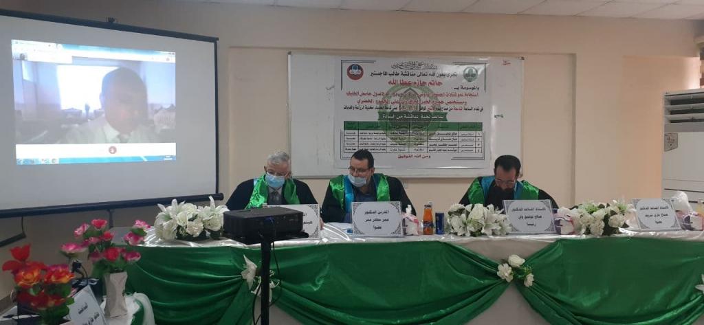 The Dean of the College, Asst. Prof. Dr. Mohammed Younis Al-Allaf and his Deputies for Scientific and Administrative Affairs attended a master’s thesis discussion in the Department of Forests/ College of Agriculture and Forestry / University of Mosul, for the student (Mr. Hatem Hazim Attallah) on Monday 14/12/2020 in the Al-Hadba’a hall and relying on a remote electronic communication with some of the members of the committee discussion.Then the discussion committee read the decision which included acceptance of the thesis and award the student an M.Sc. degree.*****Congratulations on Obtaining Your Master’s Degree*****