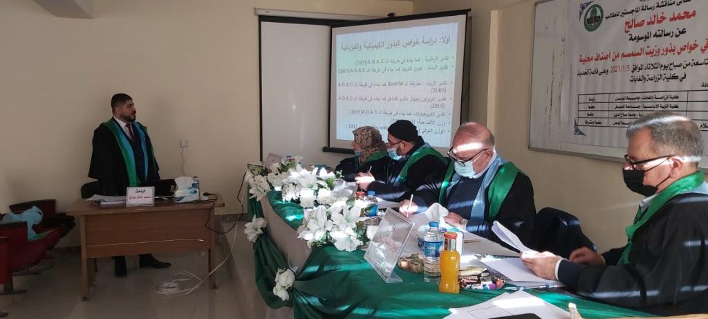 Deputies Dean for Scientific and Administrative Affairs attended a master’s thesis discussion in the Department of Food Science / College of Agriculture and Forestry / University of Mosul for the student (Mr. Mohammed Khaled Saleh) on Tuesday 5/1/2021 in the Al-Hadba’a hall.The discussion committee consisted of: