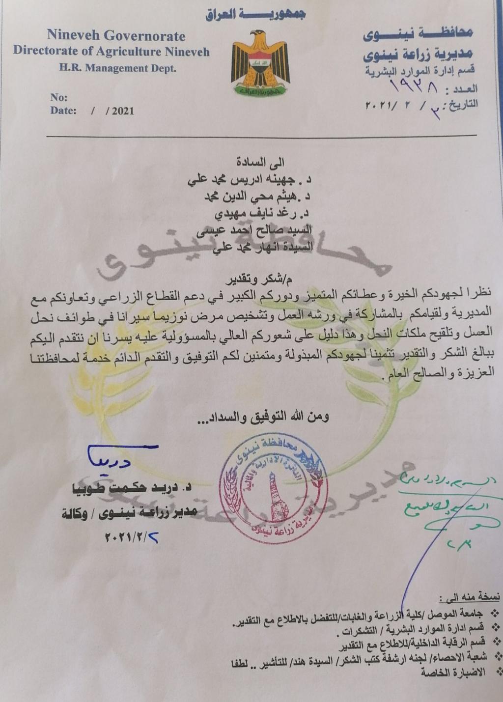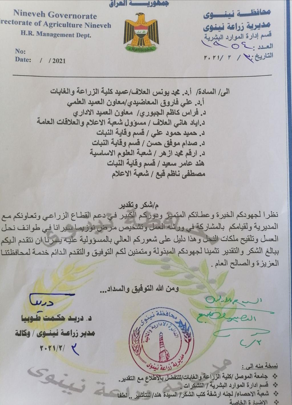 The Dean of the College and a number of its employees receive a letter of thanks and appreciation from the Director of Nineveh Agriculture.