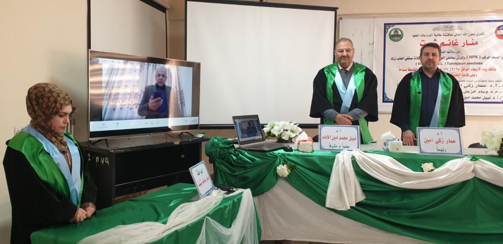 Within the scientific activities of the Horticulture and Landscape Architecture Department, a higher diploma thesis in Horticulture and Landscape Architecture was discussed for the student (Manar Ghanem Sheet). The Dean of the College, Dr. Muhammad Yunus Al-Allaf, attended part of the discussion that was held on Wednesday, 2/24/2021, in the Al-Hadbaa Hall in the College Deanship.The discussion committee consisted of: