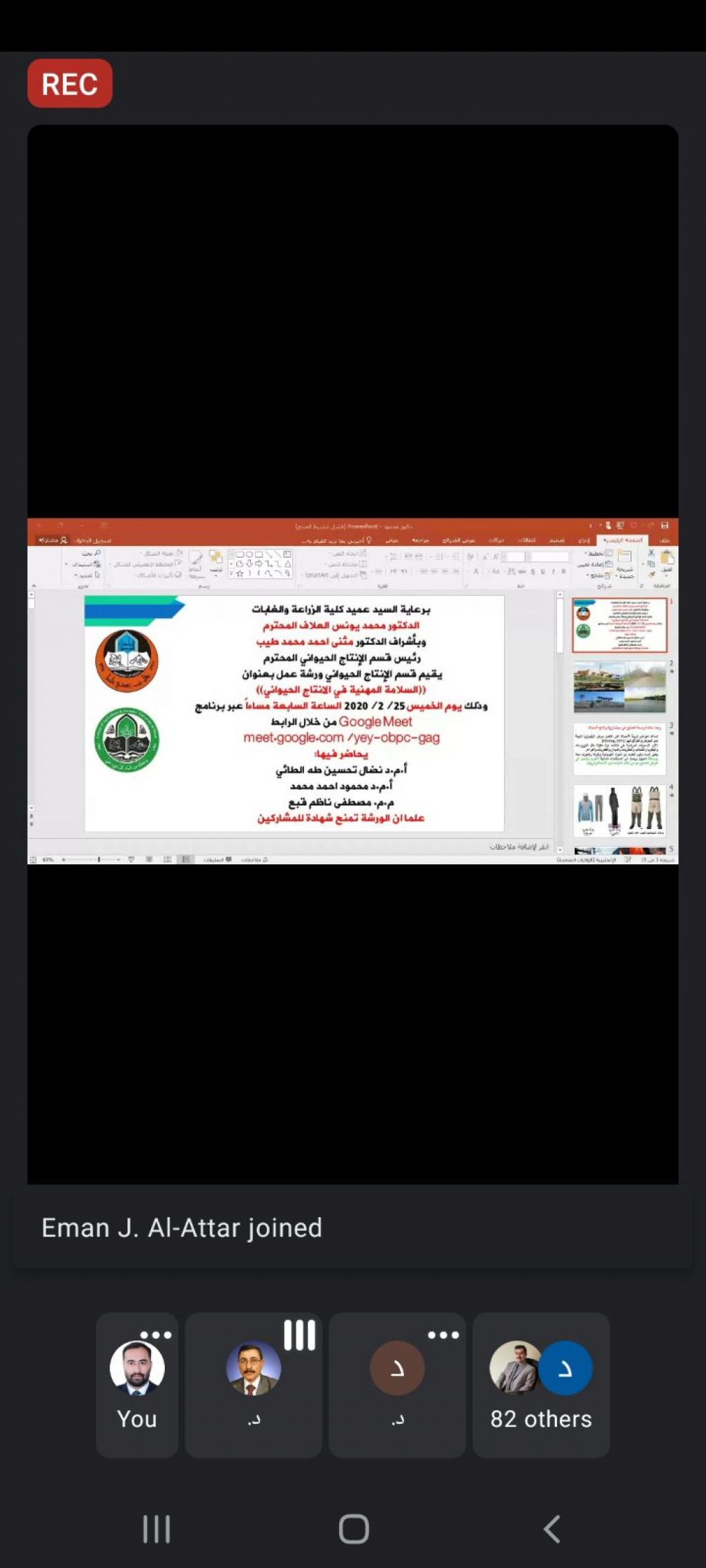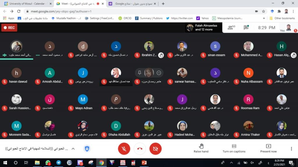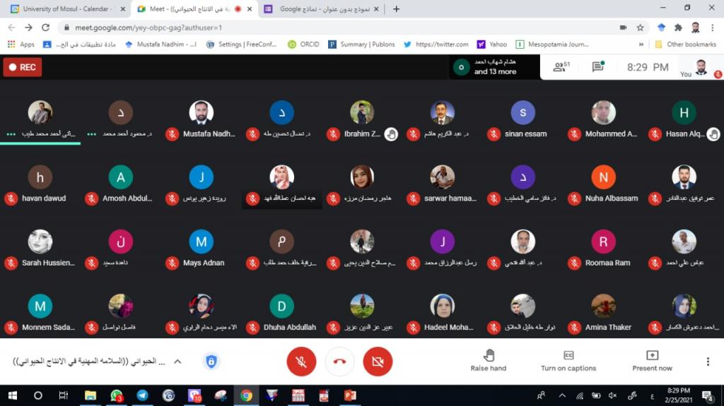 Under the Patronage of the Dean of the College, Asst. Prof. Dr. Mohammed Younis Al-Allaf, the Department of Animal Production held an electronic training course entitled ” Occupational Safety in Animal Production ” by using the interactive program MEET on Thursday, 25-2- 2021. The workshop was presented by Asst. Prof. Dr. Nidal Tahseen Taha Al-Taie, Asst. Prof. Dr. Mahmoud Ahmad Muhammad, and Assistant Lecturer Mustafa Nazem Qabaa